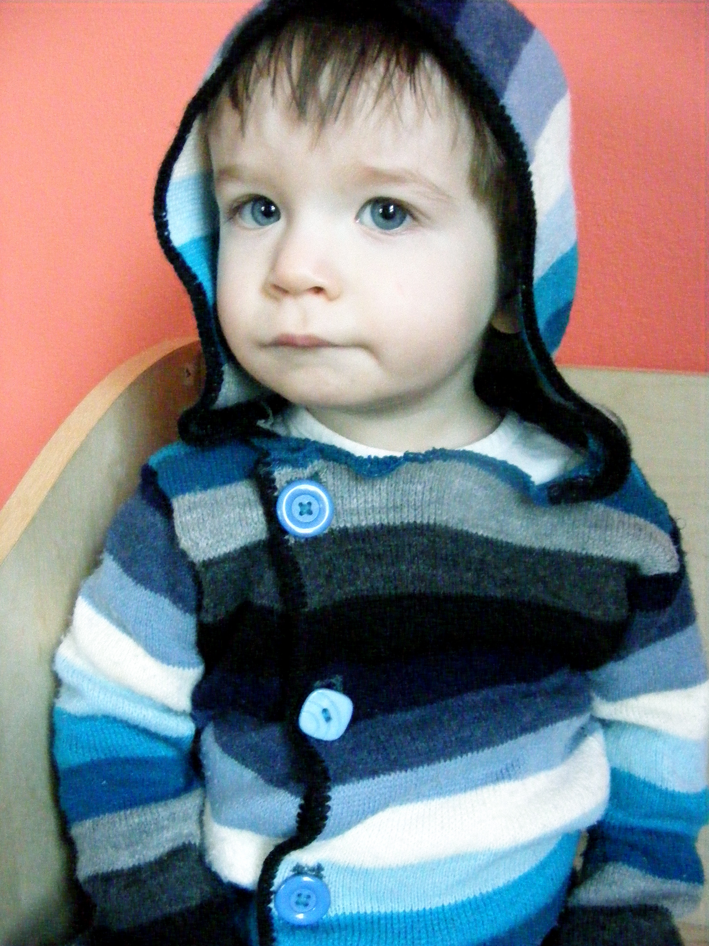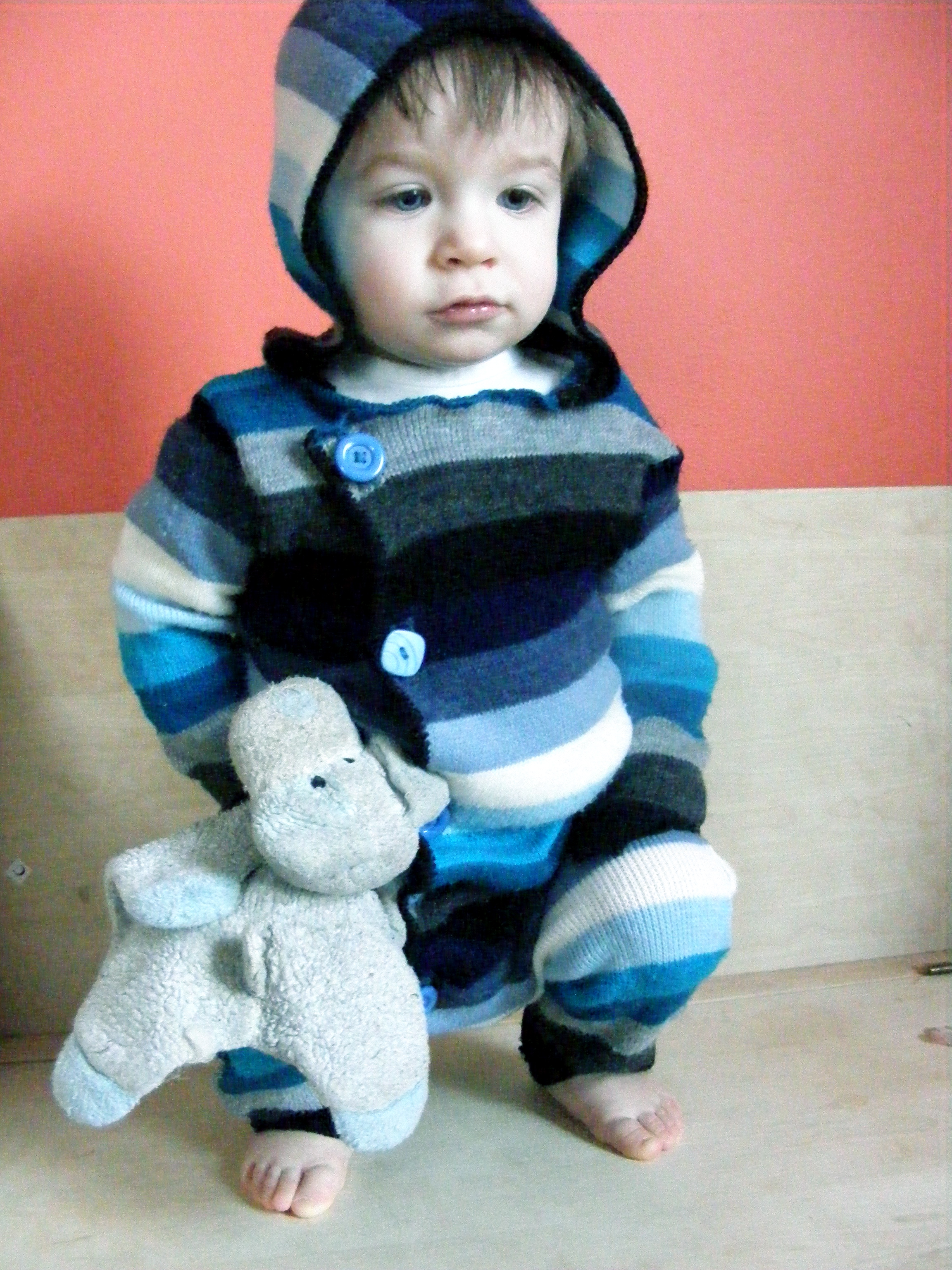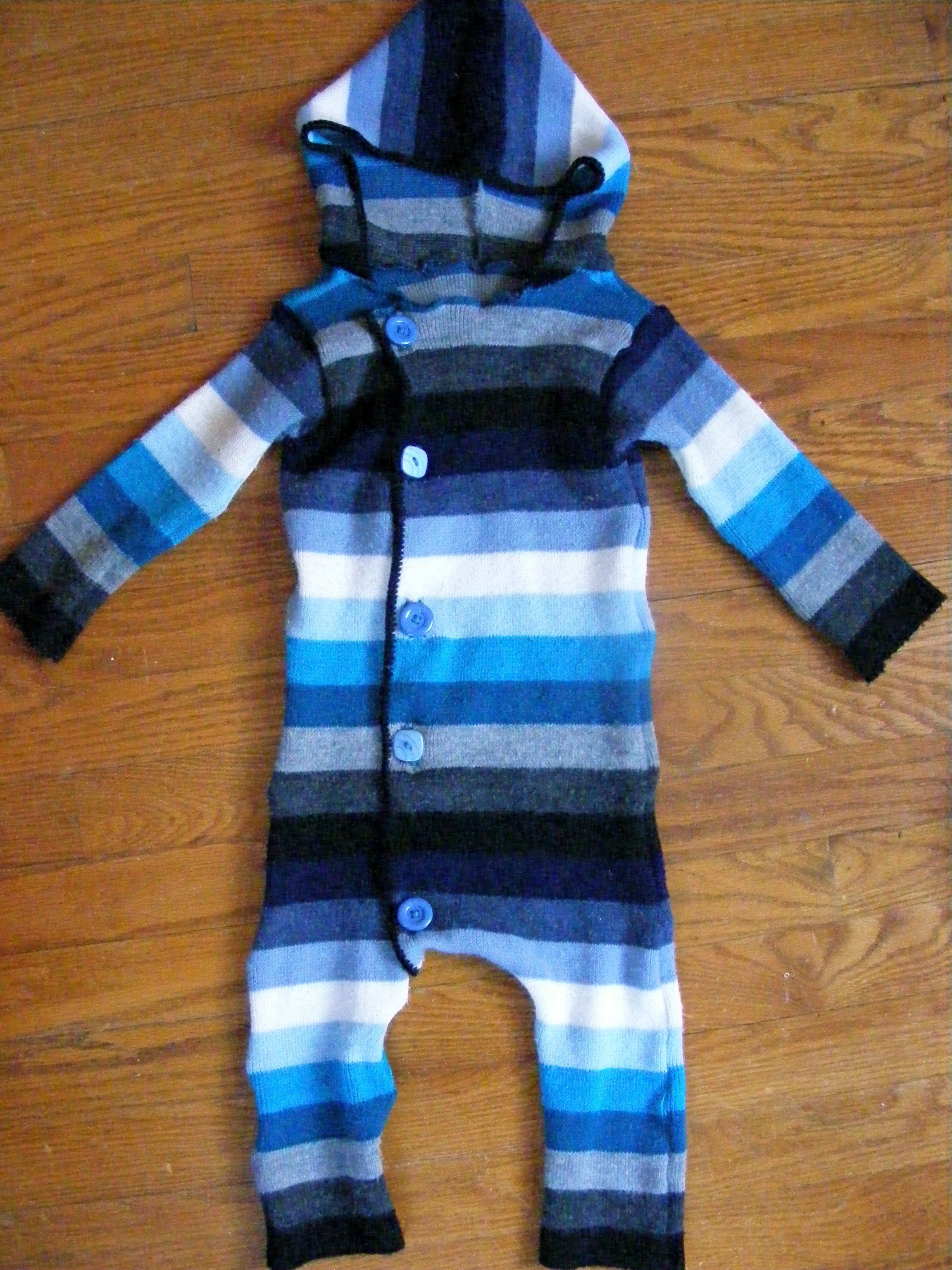 This was (shocking, I know) upcycled from an old cardigan of mine. I loved the colors, and just couldn’t part with it, even though I hadn’t worn it in years. I was too eager to get cutting that I forgot to take a before shot, but it was long and had a hood (no buttons, just a tie). I used a one-piece long underwear that currently fits little E to get the right size.