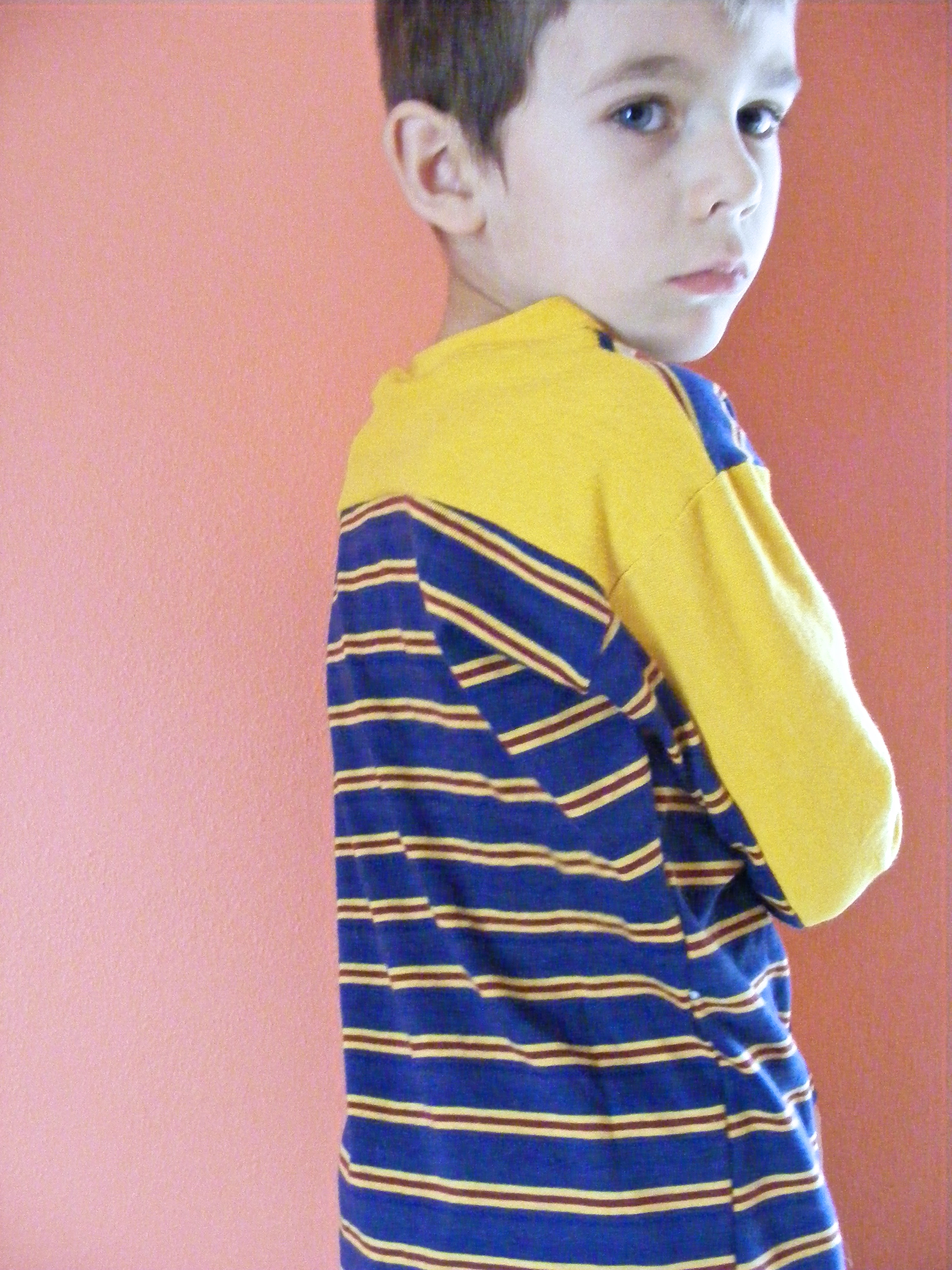 Despite the look on his face, he loves it. Put it on and wouldn’t take it off. And he wore it with yesterday’s pants… even though they didn’t match at all. He called the outfit his “sewing clothes.” Never grow up, little boy.