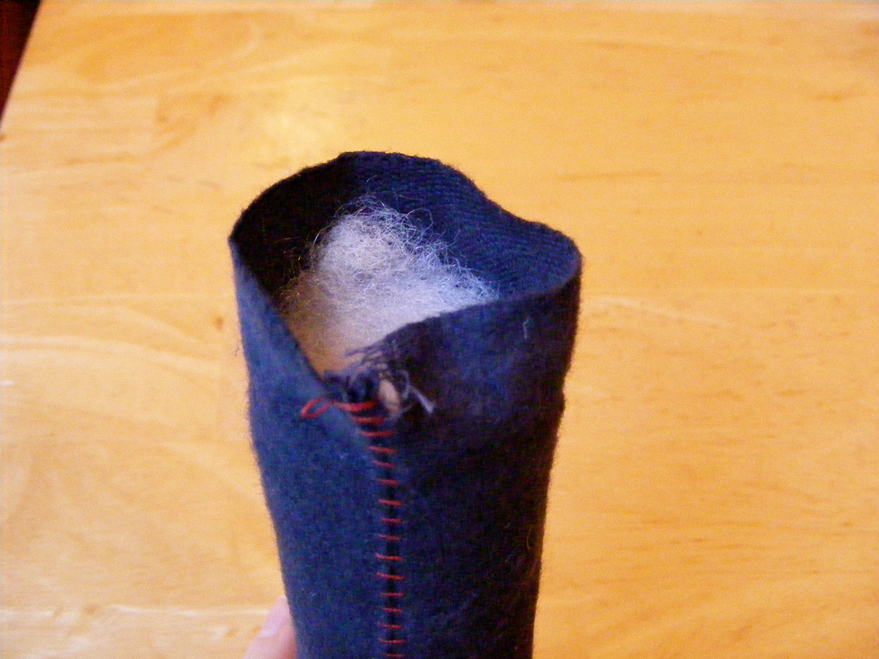 5. Turn right-side out and stuff with poly-fil. You want it to be pretty well-stuffed, so that the light saber will actually hold up and not flop over. [that’s also why it’s best to use a fabric with little stretch – it will be much better for light saber fights]