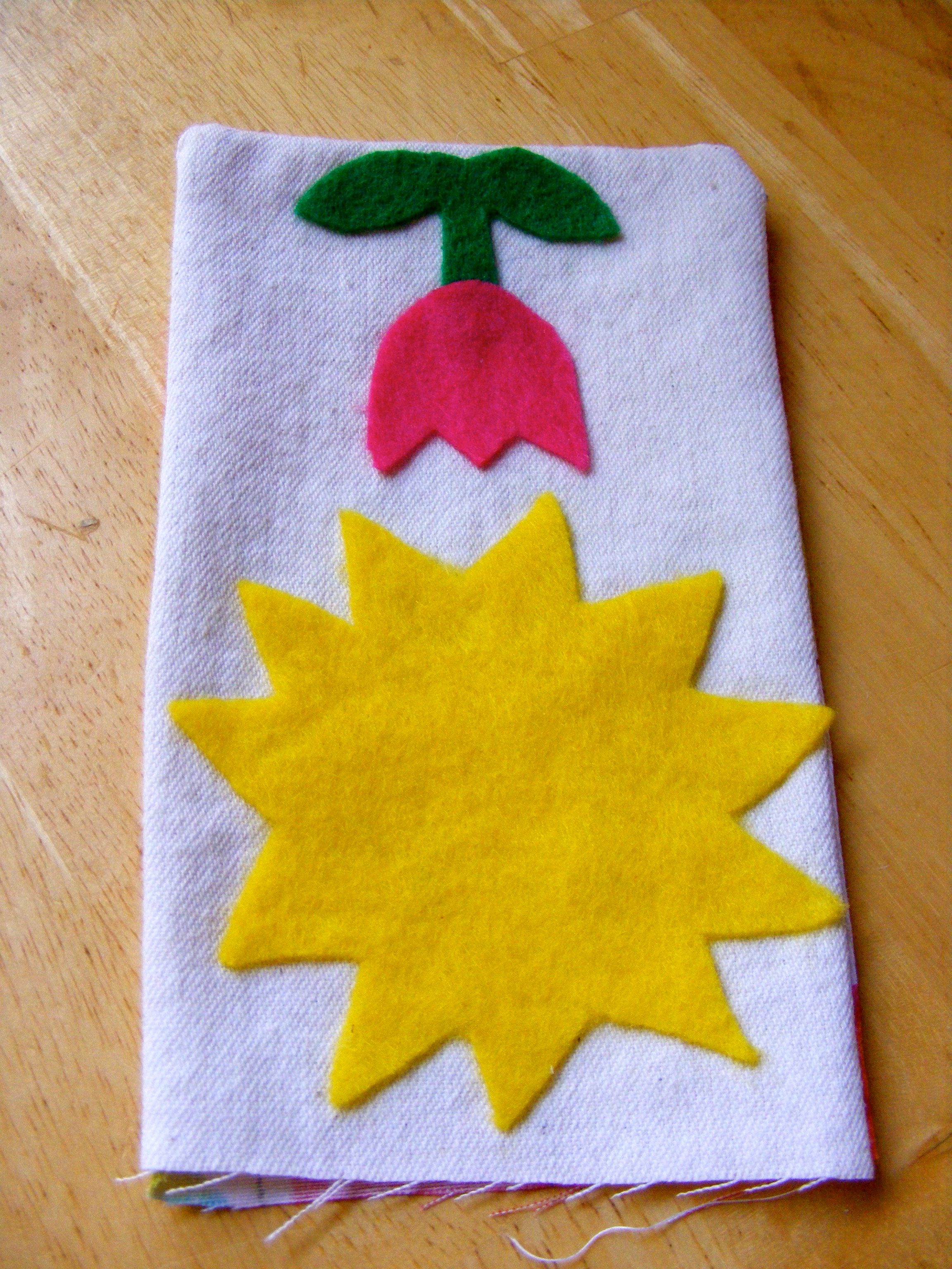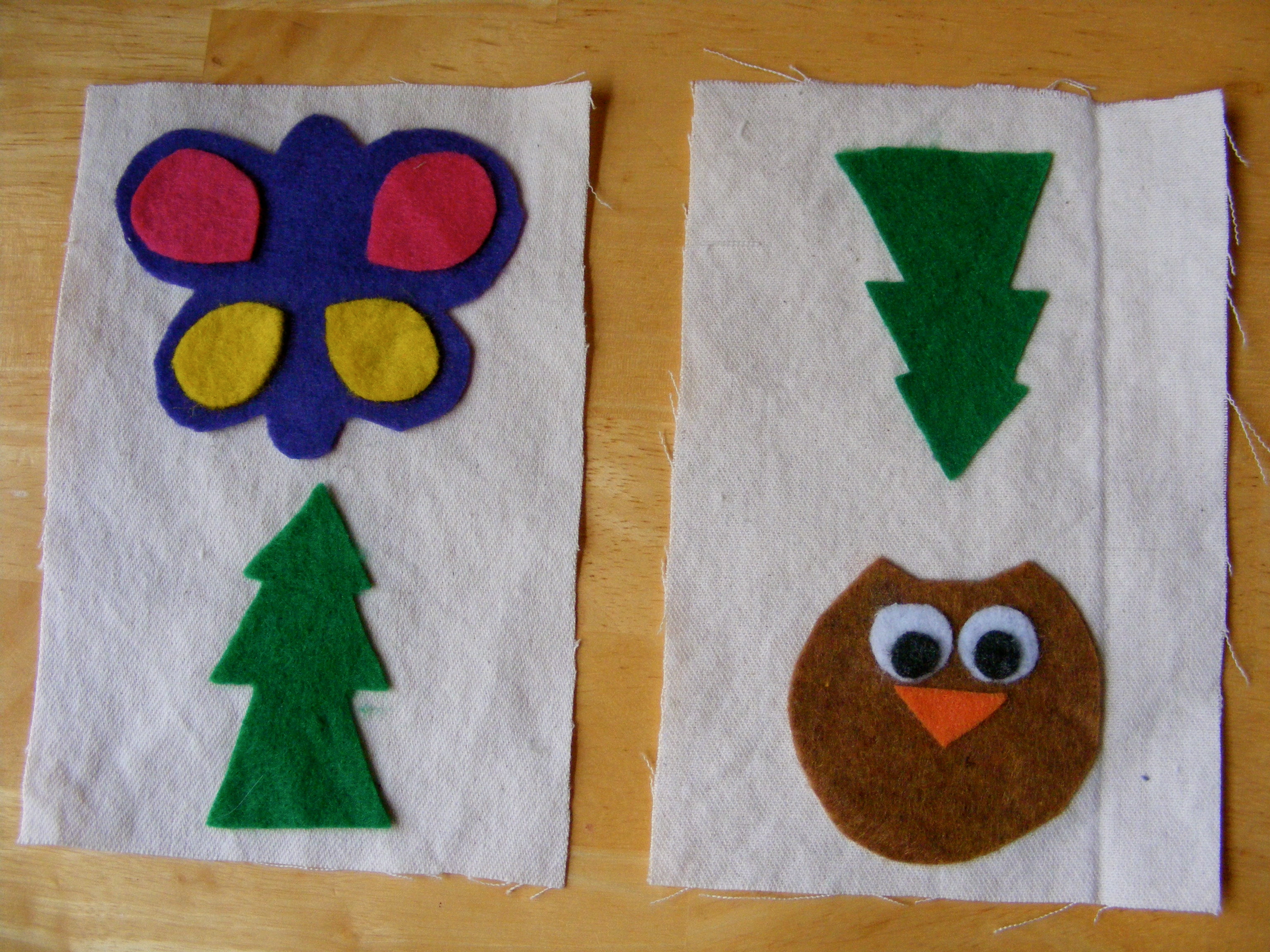 2. Cut felt shapes – you’ll want at least three of each shape. The more matches you have, though, the more fun the game will be. And the more time your little one can spend playing it. Then, using either hot glue or craft glue [hot glue would hold better], attach the shapes to your fabric.