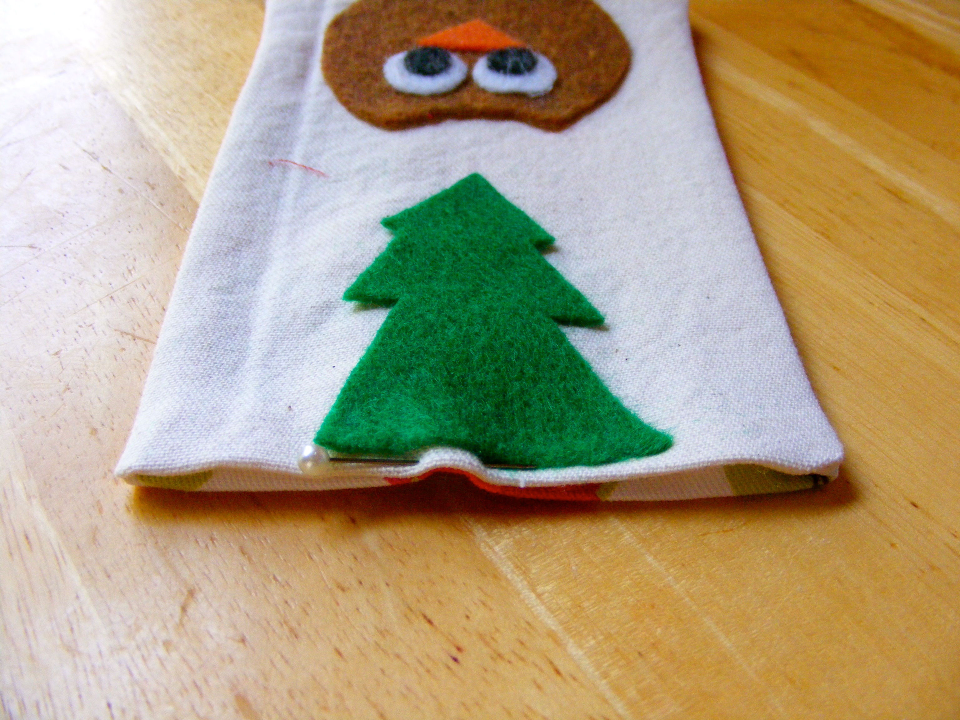 5. Fold the unfinished edges under and press. Use a pin to hold in place.