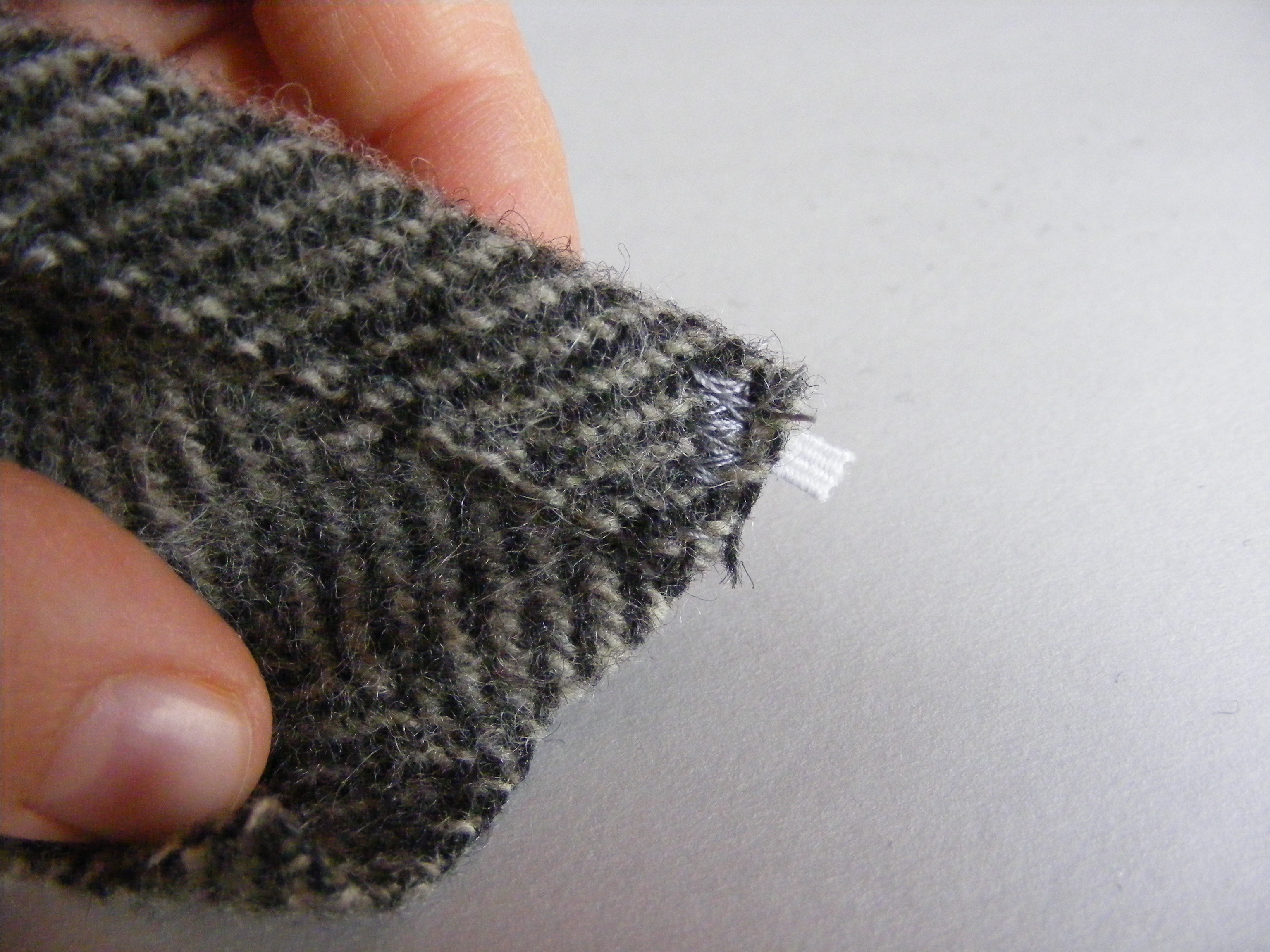 7. When your elastic is just barely sticking out of your wool, zig-zag the end to attach it. Then pull the rest of the elastic to the end [the wool will bunch up slightly as you do this] and zig-zag the other end.