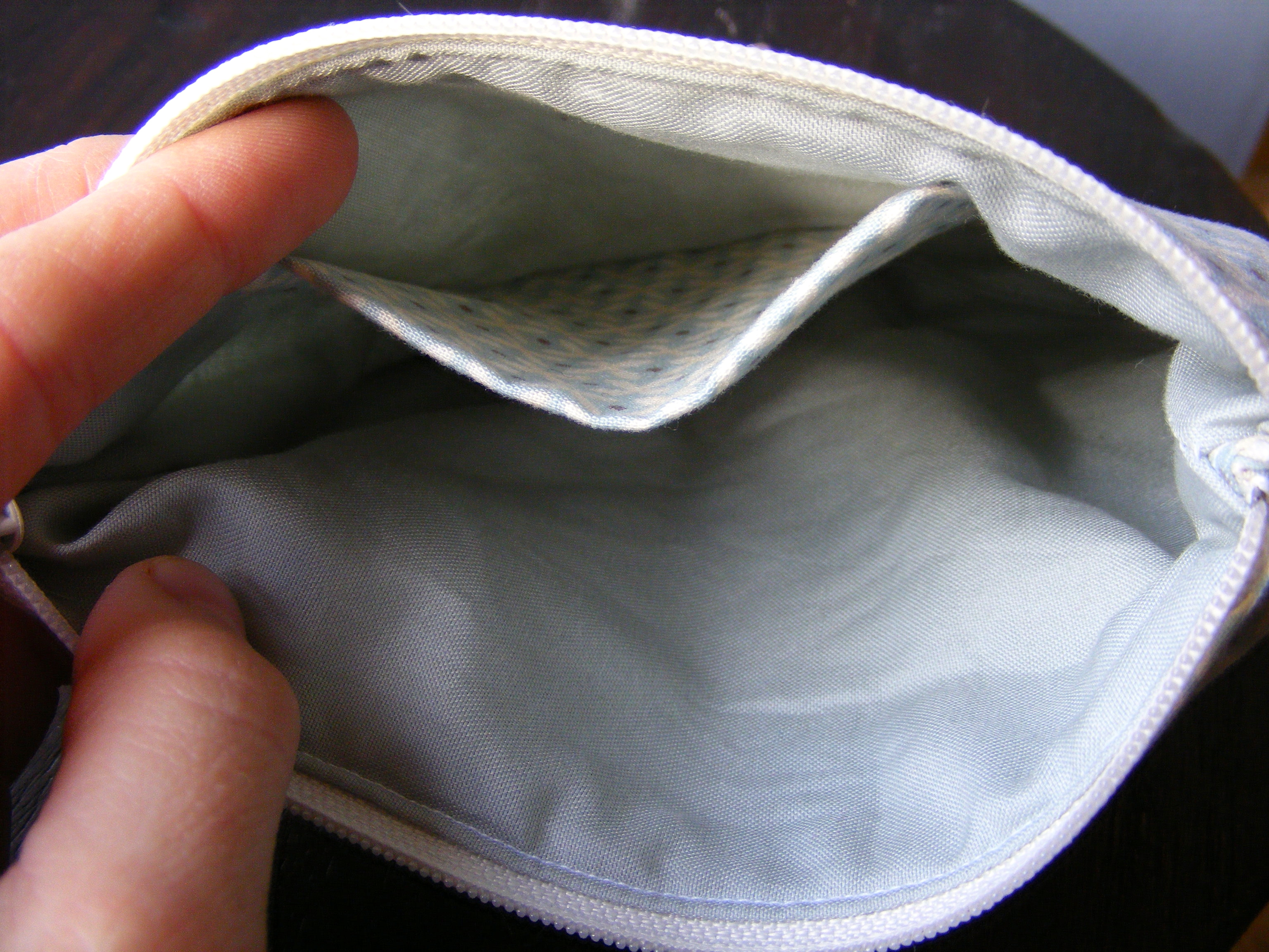 Cute little interior pocket, for cards and whatnot. I put some lace, fun pink elastic, and fabric inside and sent it along to its lovely new owner [who happens to be the mama of girls, so she’ll probably appreciate the lace and pink elastic a little bit more than me!]